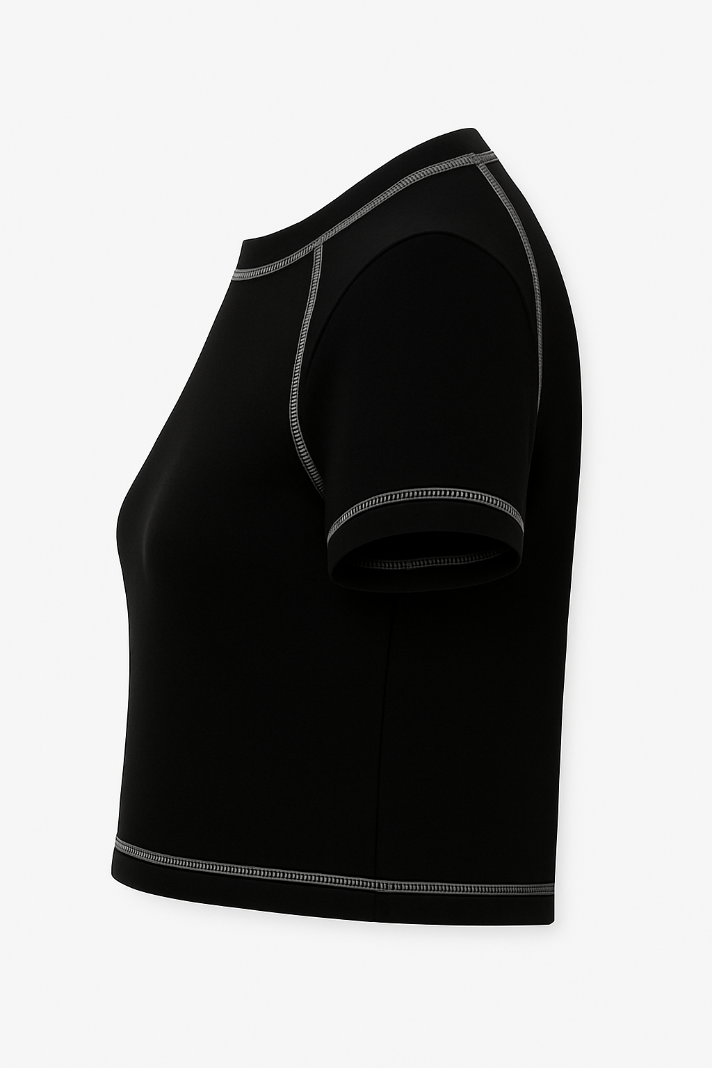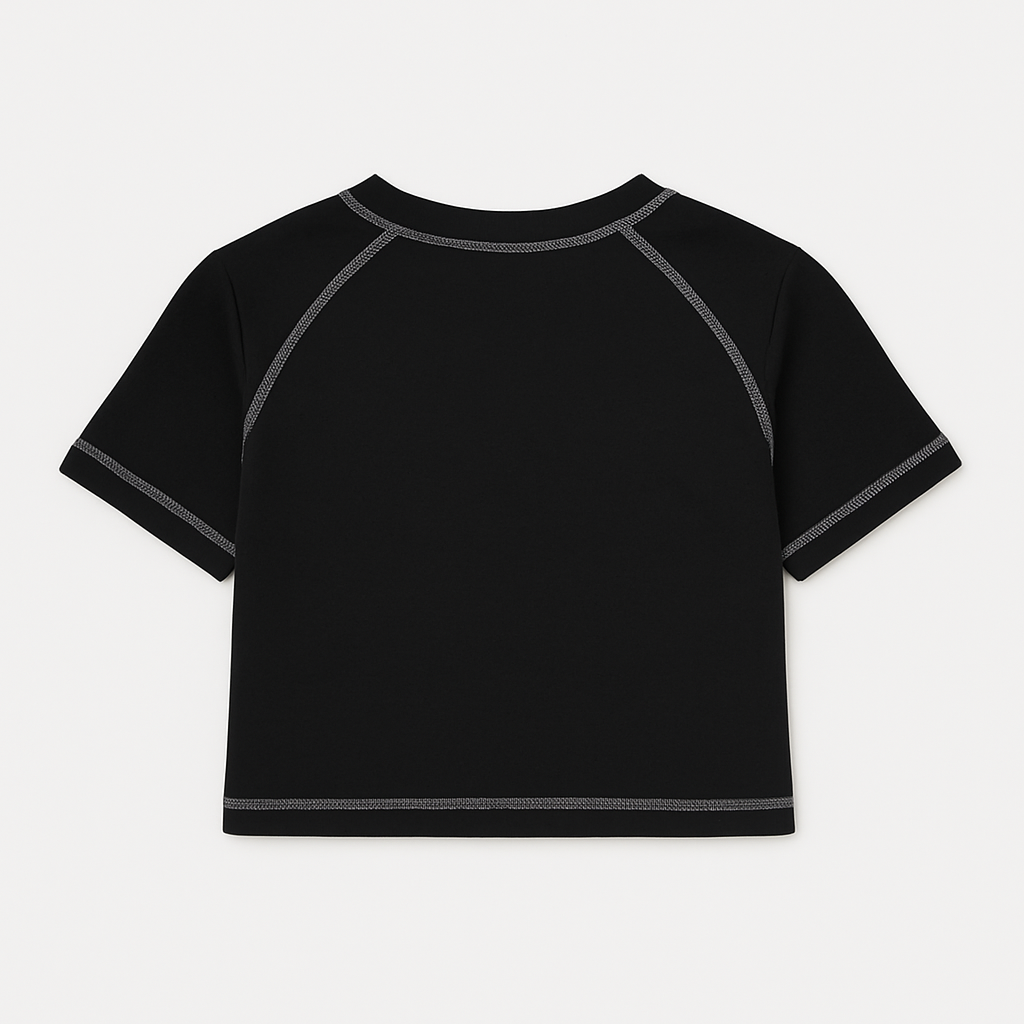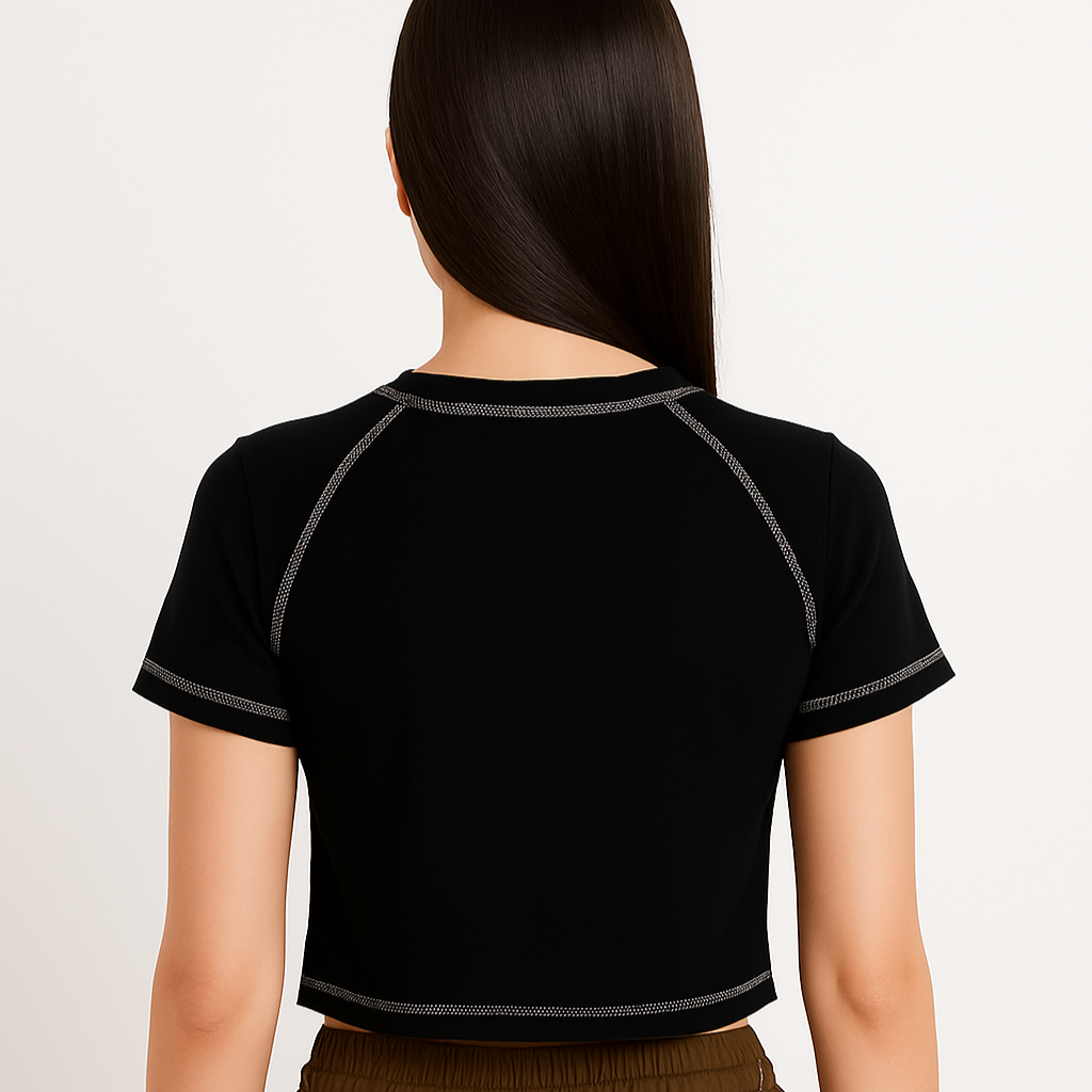 The Black and White Era - a plain black crop tee with bold and unique white stitch for a striking contrast, is timeless essential for any wardrobe. Meticulously crafted with precision, this piece is perfect for both casual and chic looks.