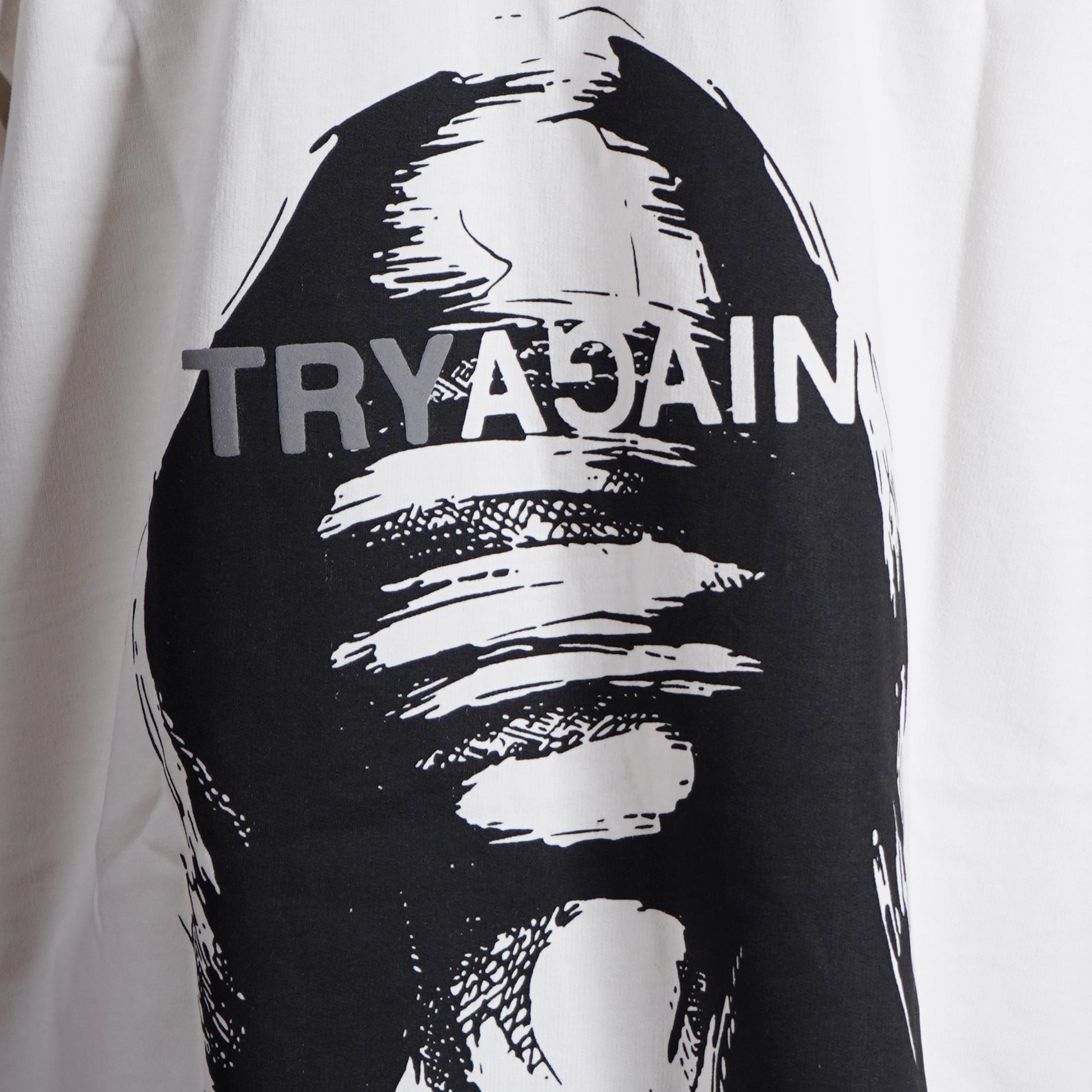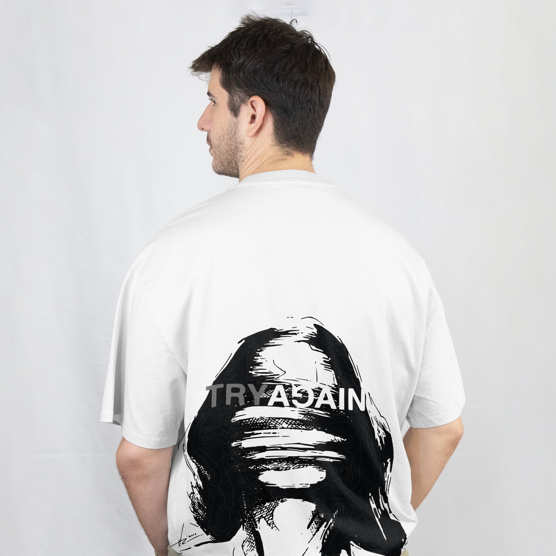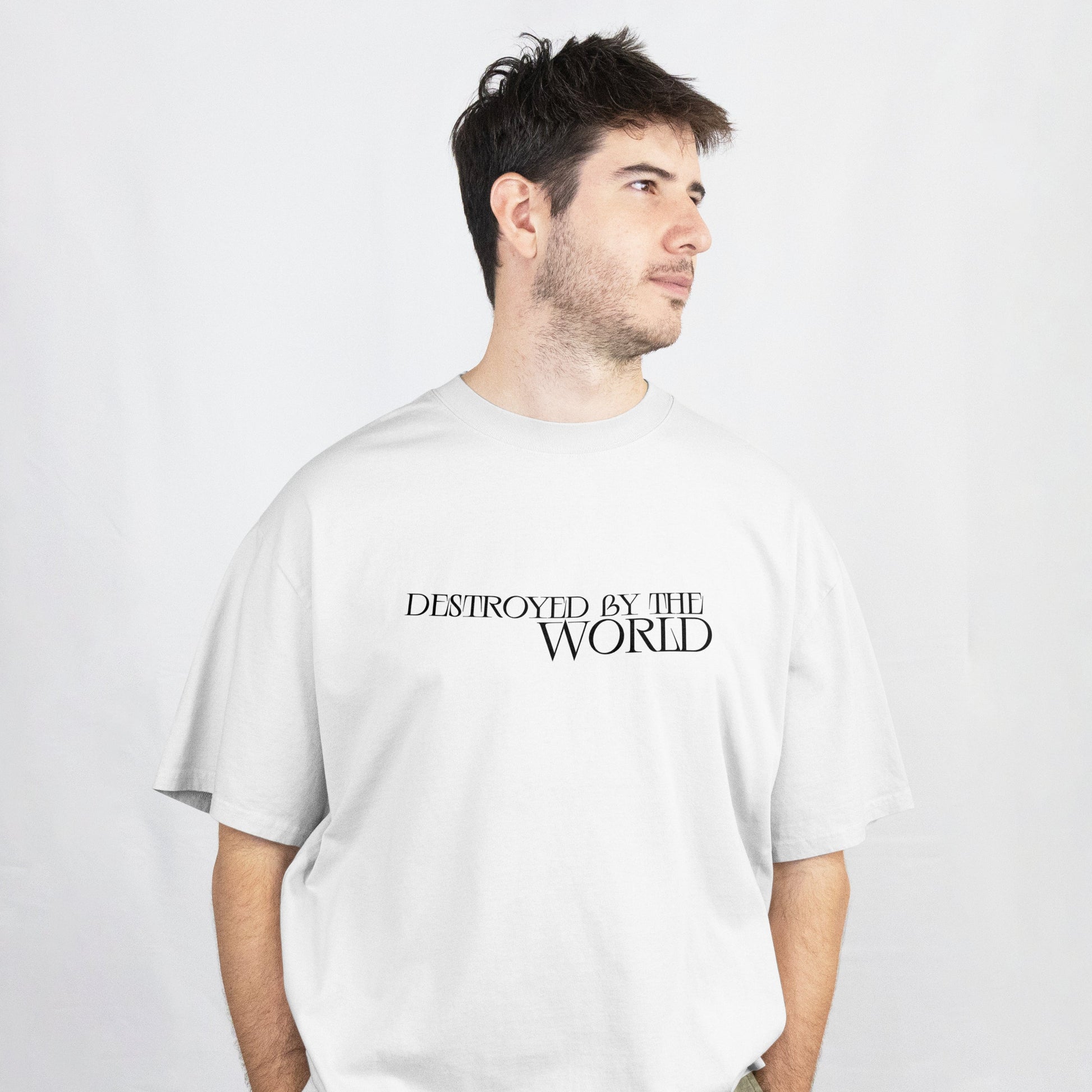 Embrace resilience in our oversized tee, featuring 'Destroyed by the World' boldly on the front and a powerful 'Try Again' to reignite your inner soul on the back. The artwork creates a striking, modern visual with bold message.