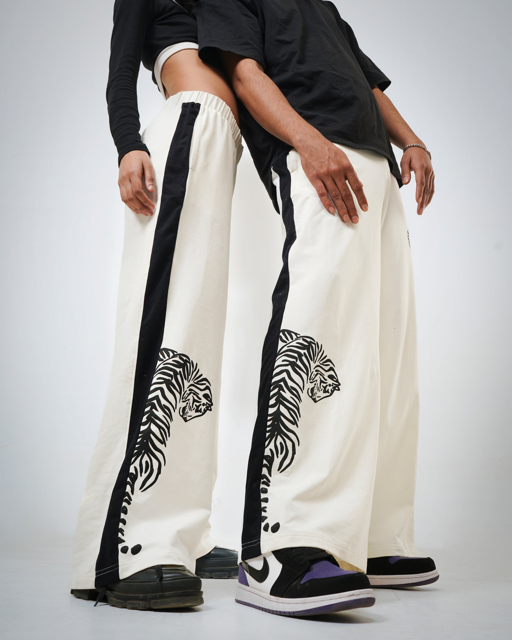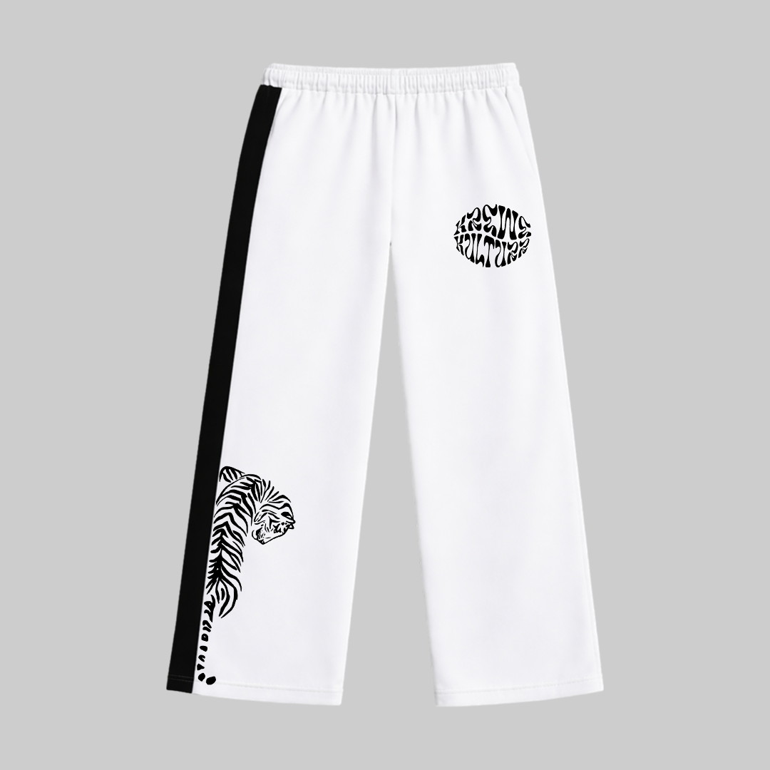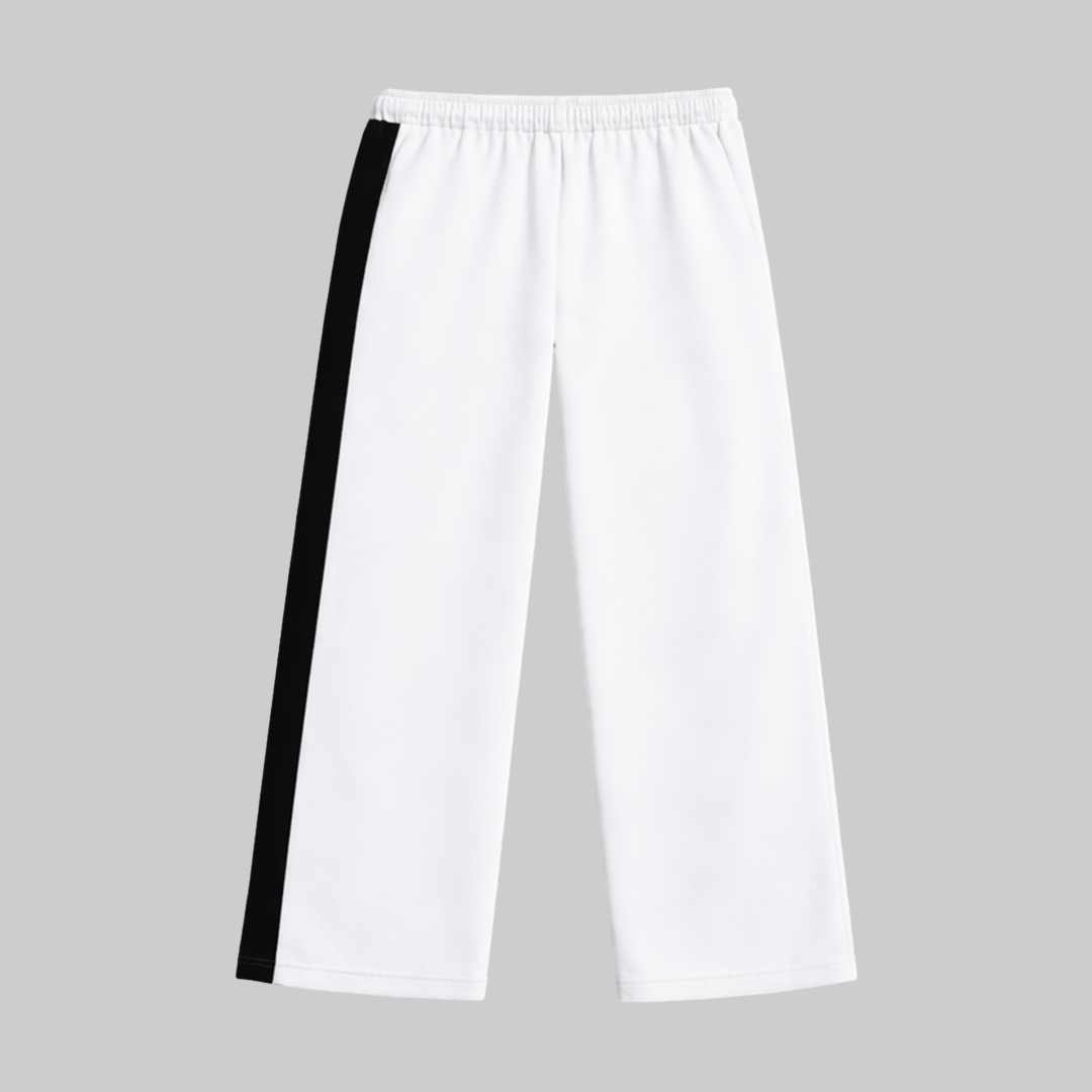 Bold meets clean in these statement lowers designed to stand out without trying too hard. The crisp white base keeps the look fresh, while the strong black side panel adds a sharp athletic edge. Graphic placements bring in that fearless energy, giving the piece a streetwear attitude with a premium finish. Cut in a relaxed straight fit with an elastic waistband for all-day comfort, these lowers are made to move with you while keeping your style locked in. Easy to pair, impossible to miss.